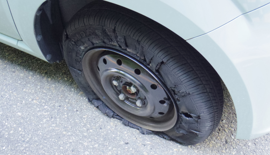 バーストとは、タイヤが外傷や経年劣化などによって破裂すること。走行中に発生すると、ハンドルを取られるなどして事故につながる危険性があります。