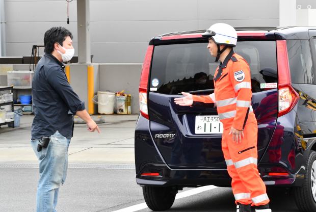 パトロール東京ではトラブル時のお客さまの安全を確保するため、遠くからも存在が目立つように蛍光の黄色いベストをお貸ししています。