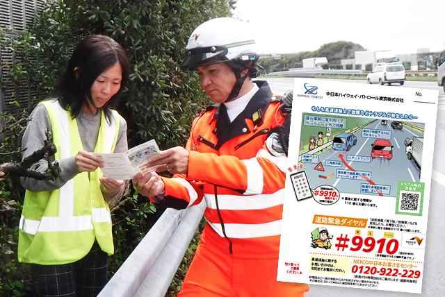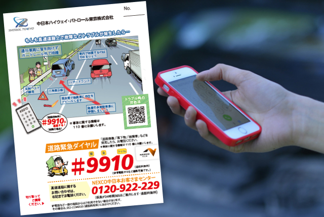 今回は私たちがすぐ発見できましたが、高速道路でのトラブルの際の連絡先「#9910」や注意事項を記載したアンケート用紙をお渡ししますので、参考にしてください。
