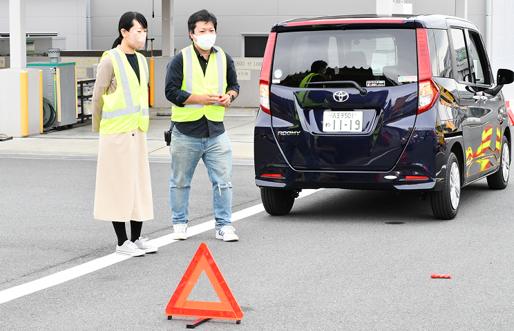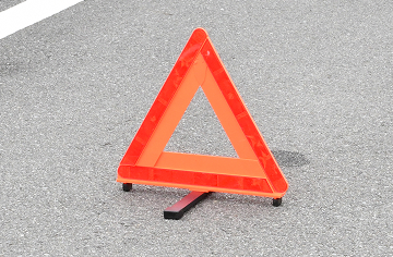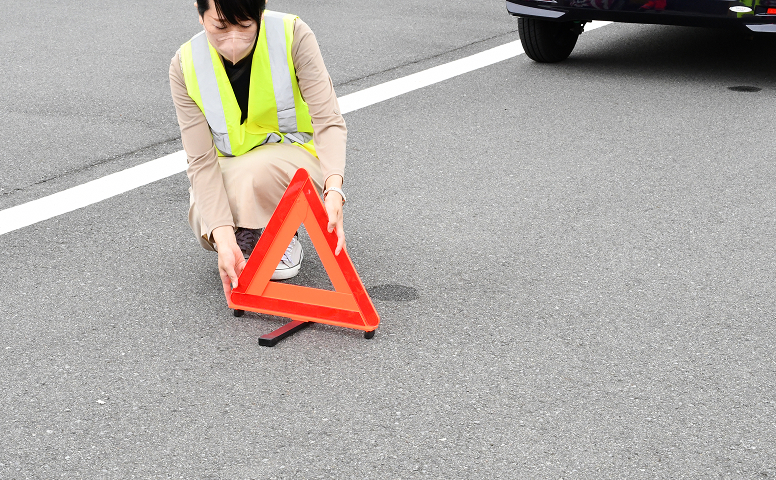故障などで停止した時は、二次事故を予防するために、ハザードランプを点灯し、安全を確保したうえで、自分で車の後方に発炎筒と三角停止表示板の設置を行う必要があります。