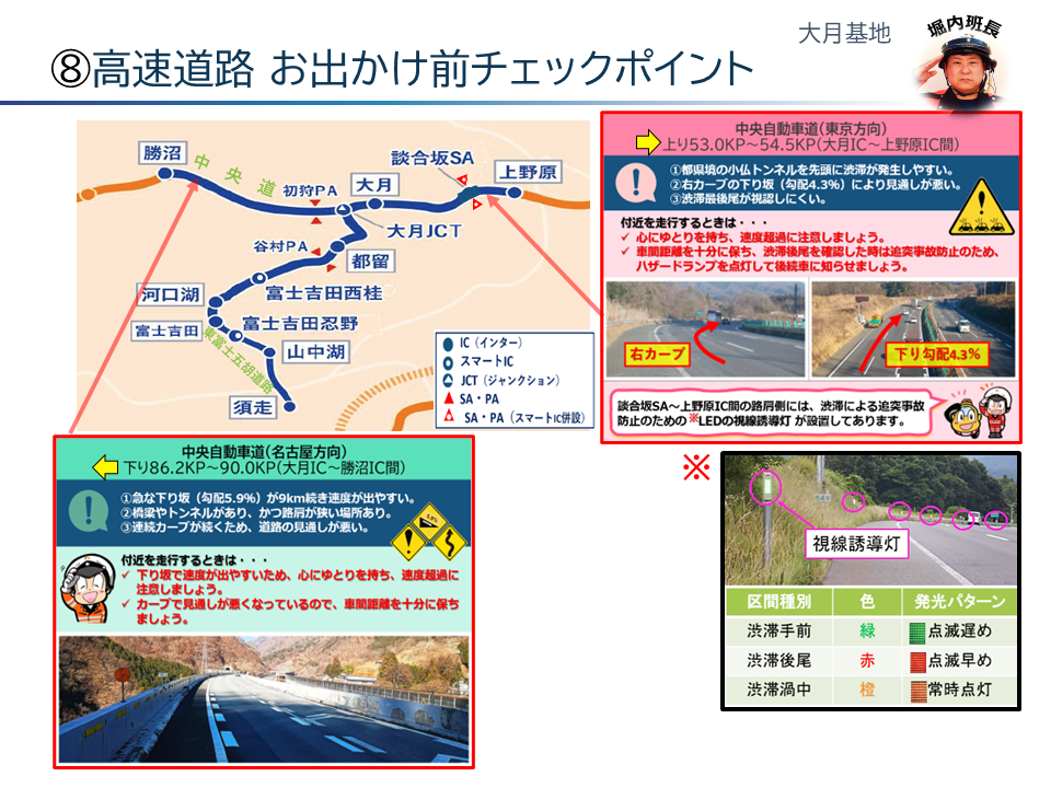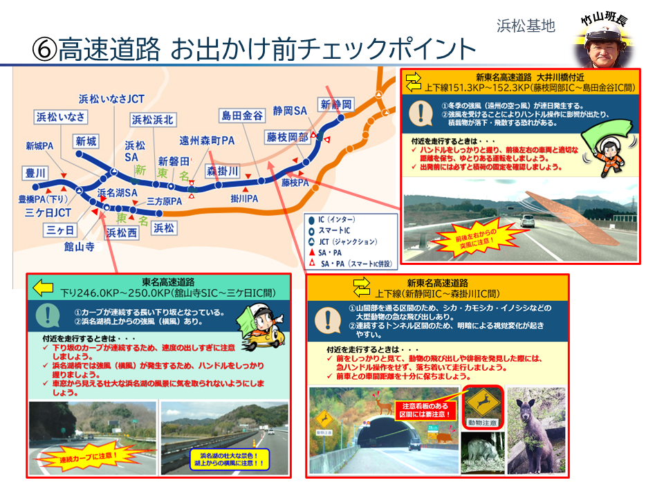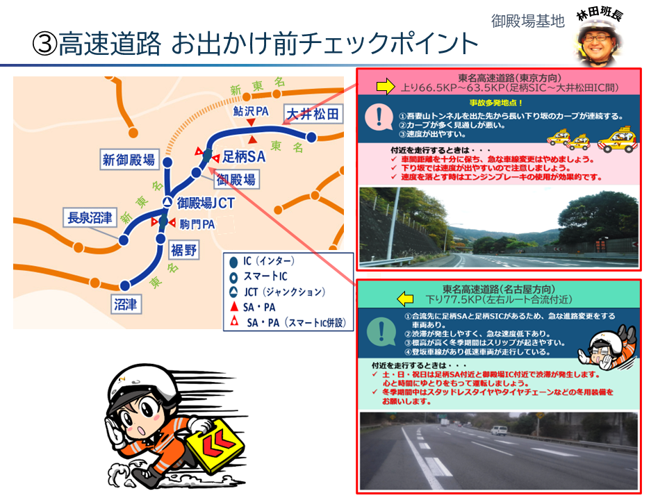 高速道路をご利用されるお客さまが、何事もなく目的地へ到着できるよう、毎日くまなく巡回をしているわたしたち交通管理隊が、