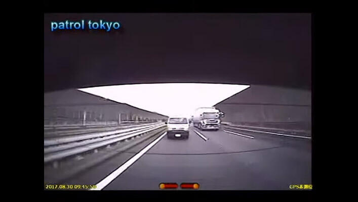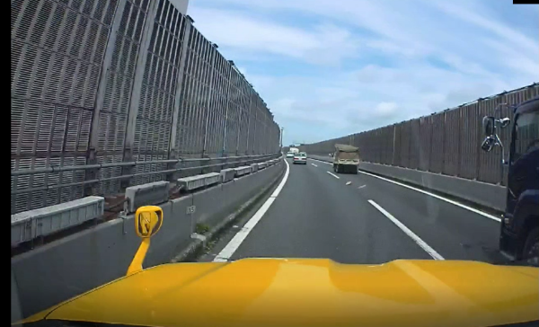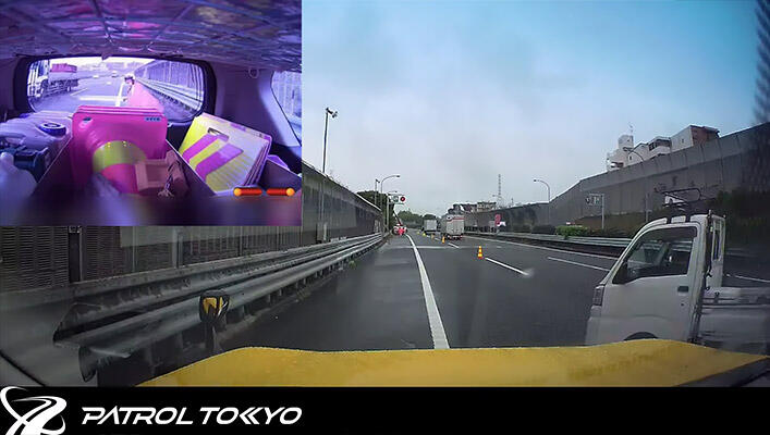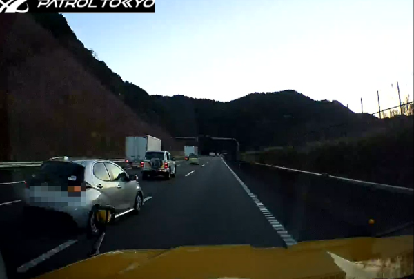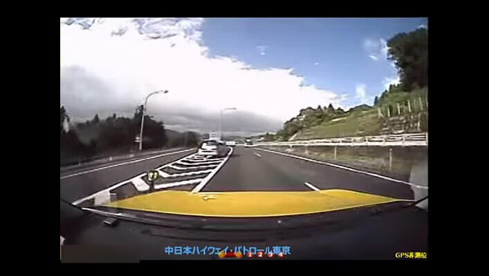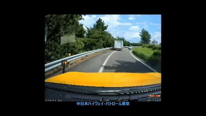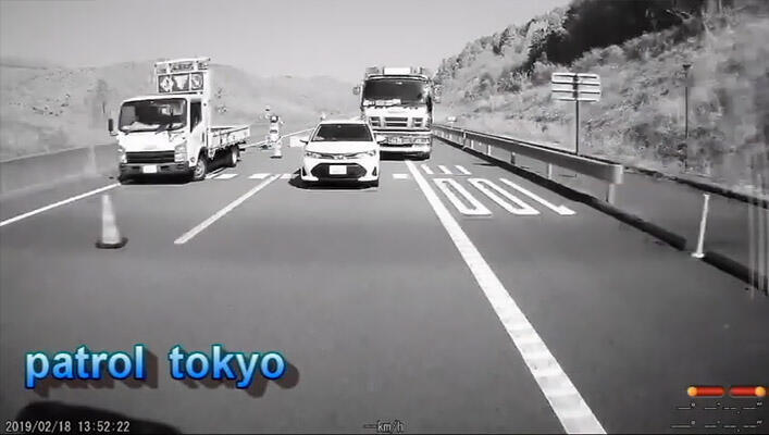 工事のため車線規制をしているところに、追越車線を走行していた車両が規制の直前で車線変更をし、トラックの前に割り込む状況に。前を走る交通管理隊の…