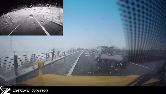 雪が降る中、追い越し車線を走行していたトラックが、前方不注視のためか前の車に急接近し、追突を回避しようとしたところ、スリップして中分側ガードレ…