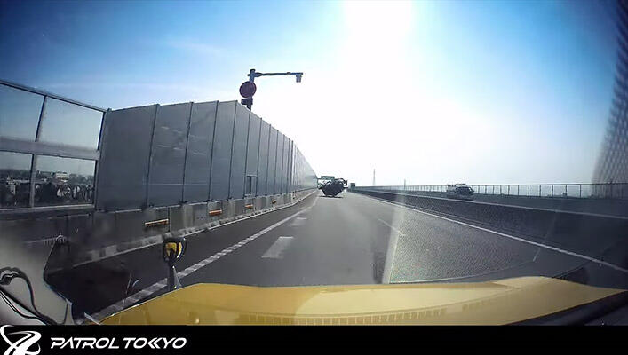 東名海老名JCTを圏央道に向けて通行中の巡回車の目の前で横転事故が発生。 トラックが本線に合流してまもなく左に斜行し、コンクリート壁に接触する…