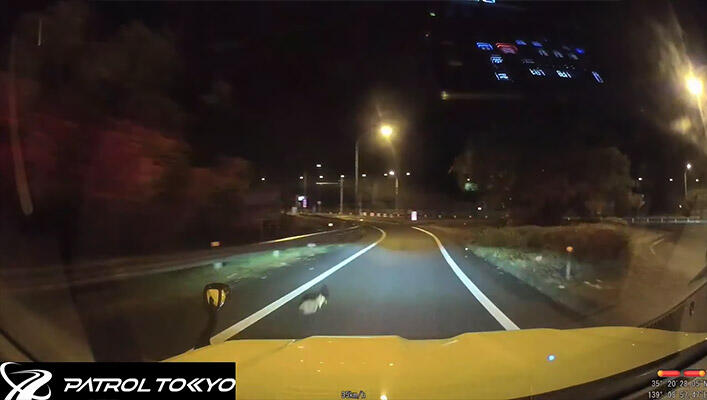 東名大井松田ICランプを巡回中、左からたぬきが飛び出し、直前で停止しました。動物の生息域に道路が建設された地域では野生動物が出没することが多く…
